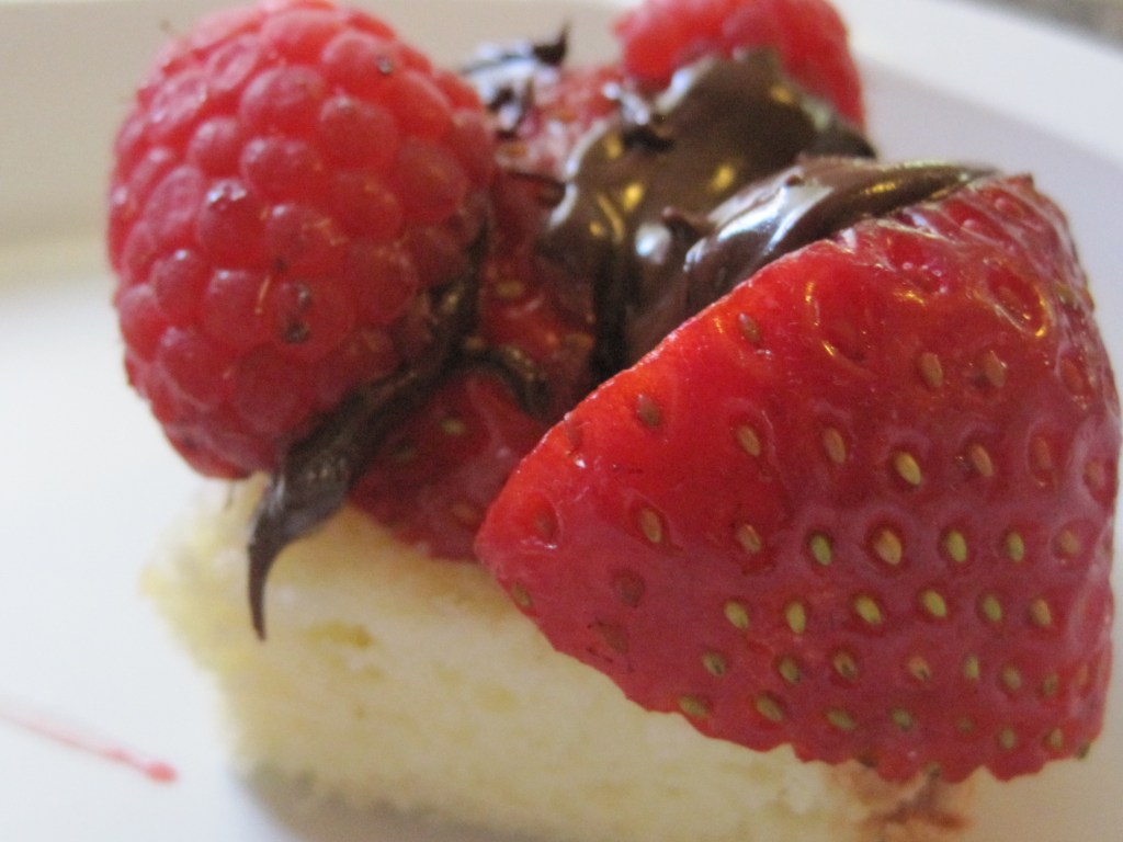 ∞ Bite sized indulgence: a sliver of vanilla sponge topped with raspberries, strawberries, and decadent melted chocolate ∞