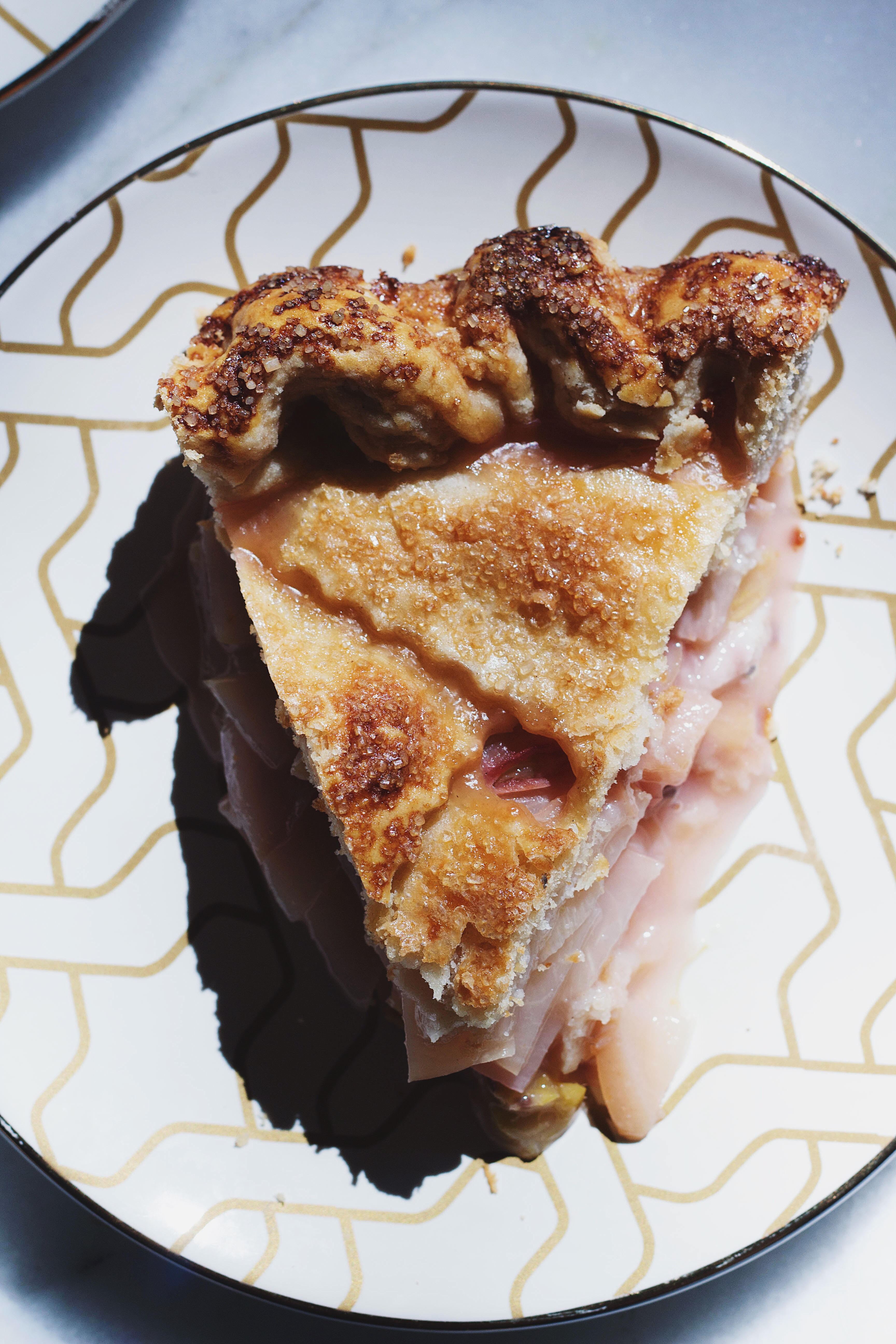 When you are ready, send the whole thing off, egged, sugared, into the oven. Get it hot hot hot. The cool butter will be shocked into place by the heat. No messy, drippy, crusts over here. Only your hard work, science, and the wonderful alchemy that is butter, steam and heat.