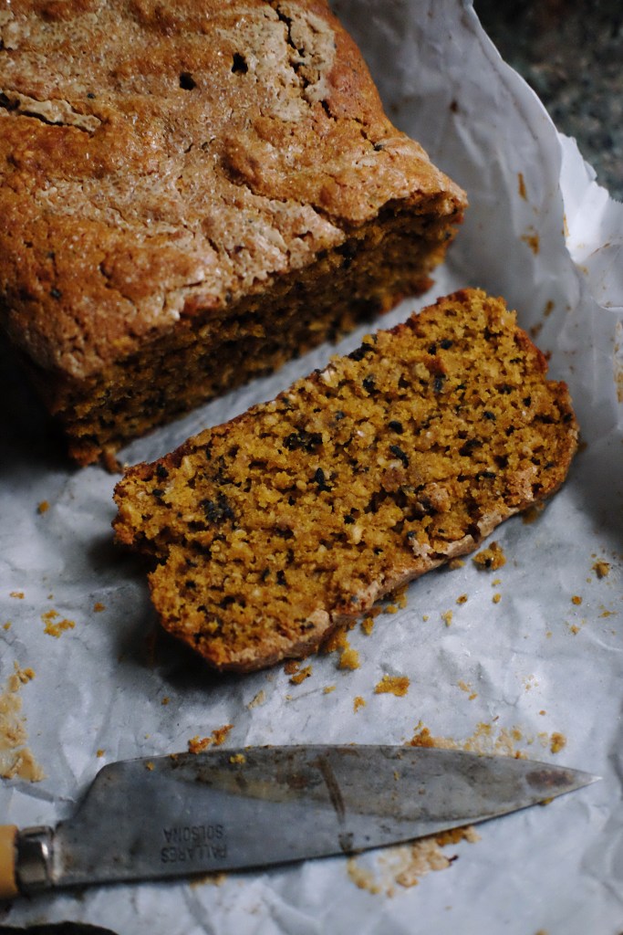 Why I love this recipe: this classic pumpkin loaf is made interesting with nutty tahini and sesame, a plethora of warming spices and a flavorful mix of oat and spelt flours. Brown sugar, eggs and olive oil keep it moist, and the slightly bitter notes in the olive oil and tahini are tamed by the caramelly-sweet kabocha squash. Serve with chai tea, strong espresso, or shots of whiskey.