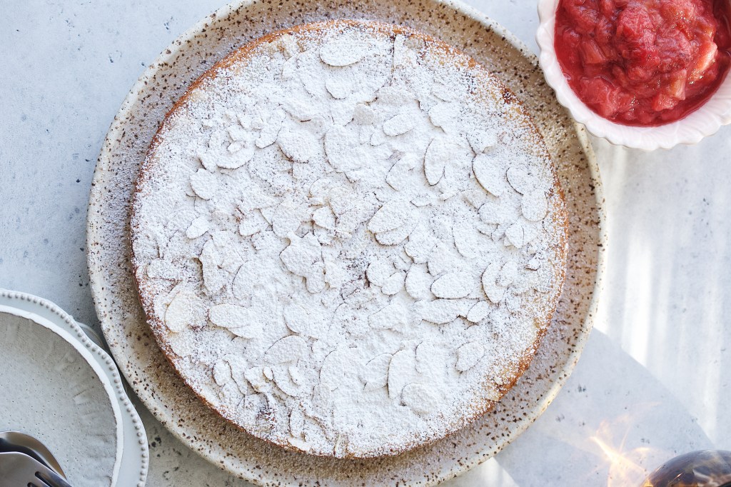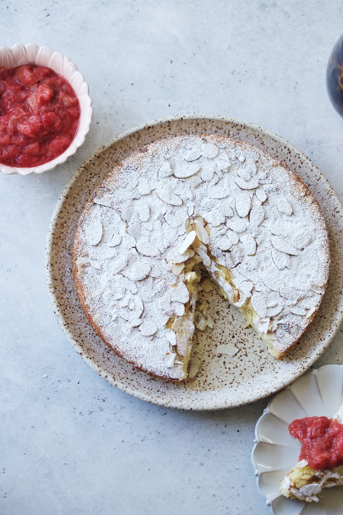 The recipe is versatile: don’t like almond extract? Use vanilla, or skip it. Serve it with lemon curd. Add finely grated chocolate to the batter, or if you have some ricotta laying around, whisk in 1/2 a cup. I like serving this with a simple strawberry rhubarb compote. The sweet-tart fruit is a perfect, seasonal complement to the crackly almond and powdered sugar top of the cake.