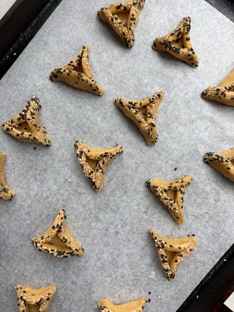 This dough takes just minutes to come together and the tahini gives it a really nice, nutty edge. (I adapted it from my old tahini marble hamantaschen recipe, if you’d like to give that one a go!) Rolling the dough into logs and covering them in sesame seeds before slicing and shaping the hamantaschen is a neat trick that means you won’t have individually sprinkle each cookie with sesame seeds- plus, they don’t fall off while baking, as they’re tightly packed into the dough.