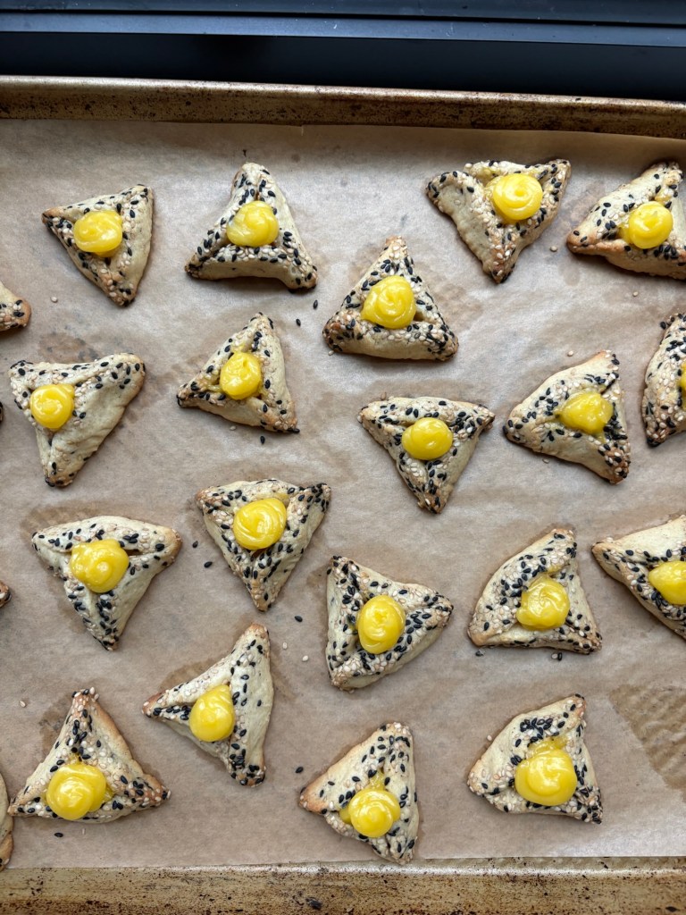- Pipe a dollop of lemon curd in the center of each hamantash. Arrange on baking sheets with an inch or so between cookies. Pop the cookie sheet(s) into the freezer for fiften minutes before baking to allow the hamantaschen to firm up.